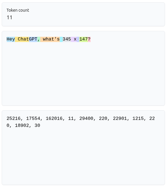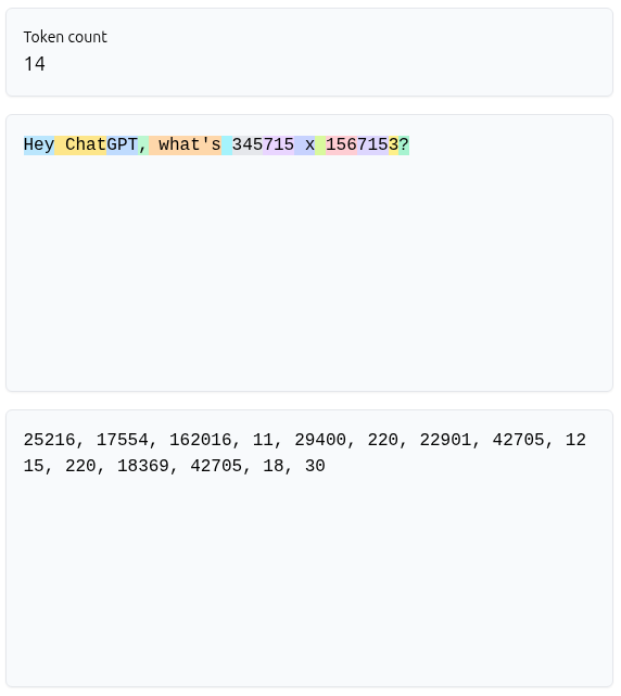 In short, ChatGPT does not see the integers 345 and 147, but other integers! That’s not really the most direct way to perform a multiplication, and that’s not surprising because ChatGPT, in the background, will work on the sequence of tokens to return another sequence of tokens.
