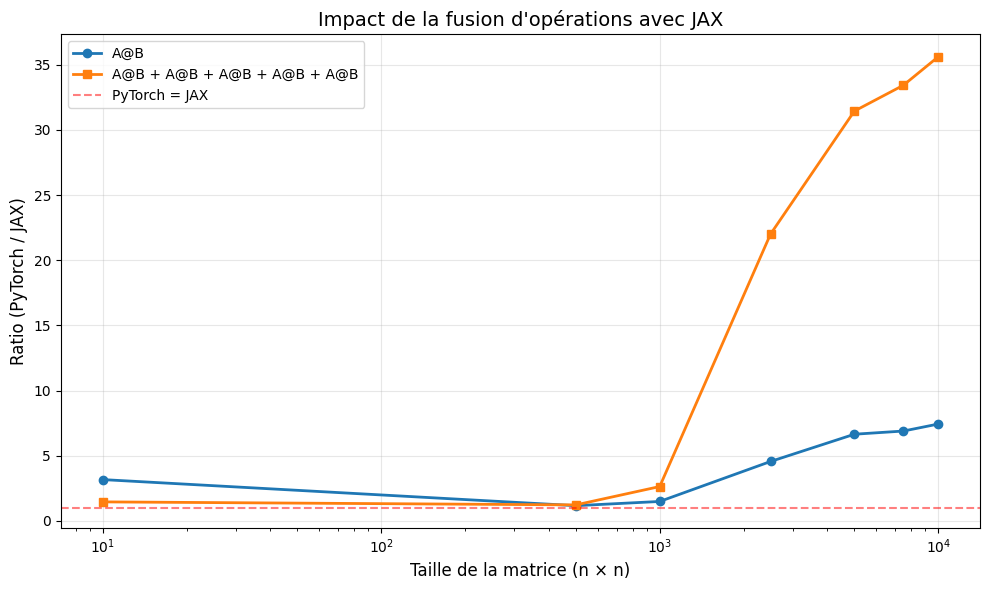 Avec JAX et sa compilation JIT (Just-In-Time), le compilateur XLA analyse l’ensemble des opérations et les fusionne : au lieu de 5 multiplications séparées, il optimise le calcul pour réduire les accès mémoire.