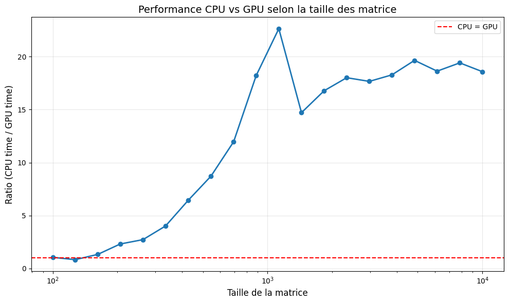 'ratio': 27.12062125218268}On peut noter que le passage de vecteurs à des matrices a un impact considérable sur le temps de calcul, et que le ratio est largement en faveur du GPU.